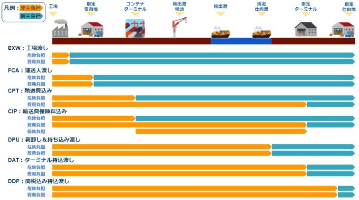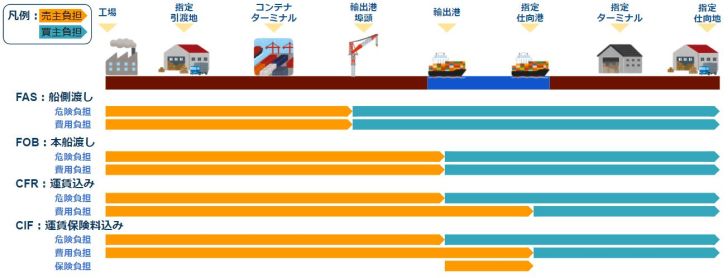 那么,我们来看一下各国际贸易术语(Incoterms)的“风险转移”和“费用承担”责任范围。