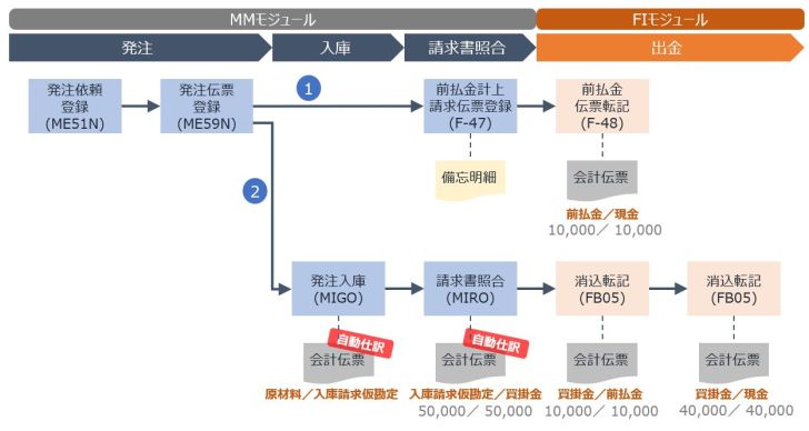 与通常的应付账款流程相比,增加了预付款记账和清账处理。